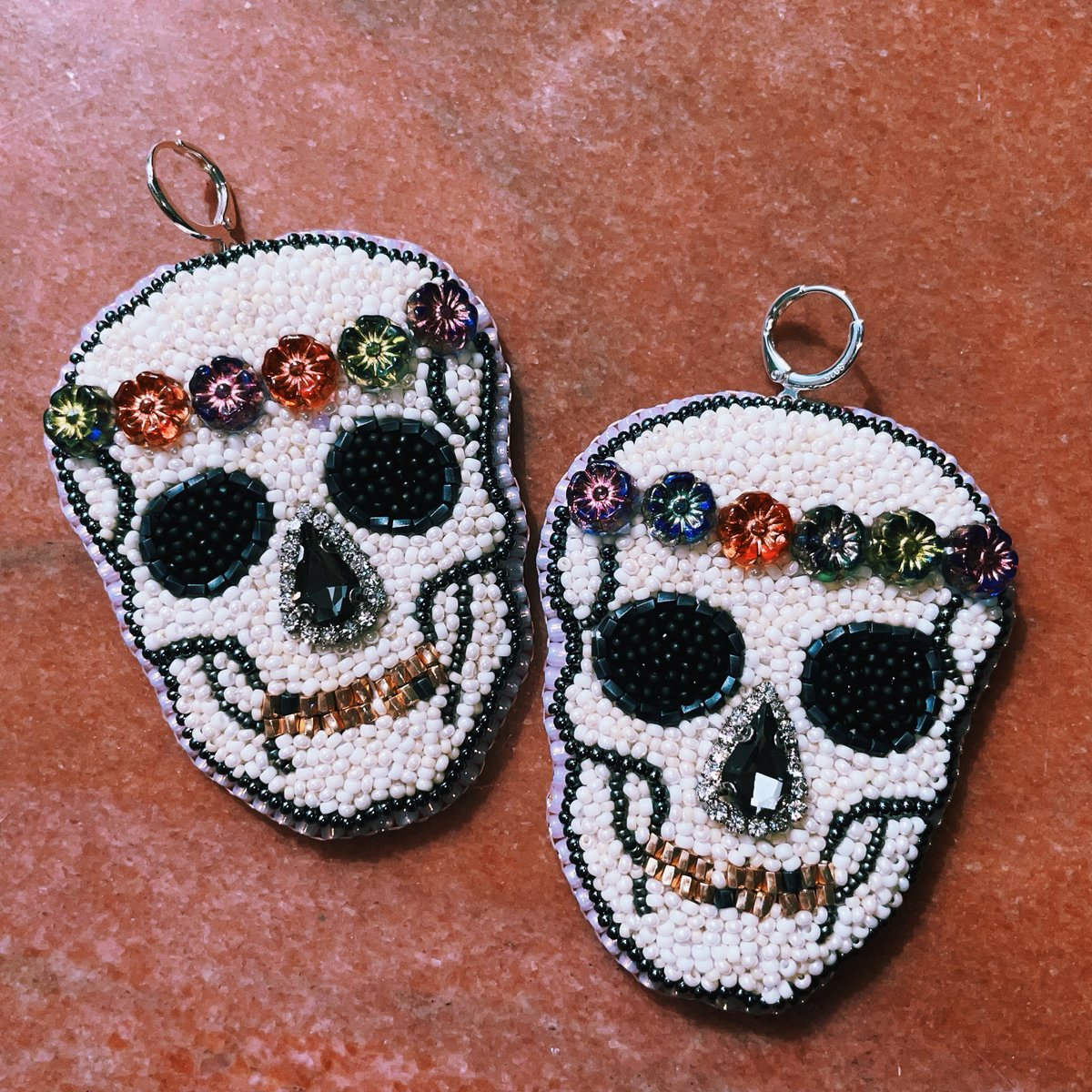 CURRENTLY AVAILABLE: first two skulls posted here. With floral crown. The eyes are flat back crystals and matte black beads and the nose is rhinestone with edging, teeth are good toned hex cut and they’re edged in antique trade beads and matte gun metal beads Czech beads. These are approx 3 inches long and backed with pink embossed synthetic leather. In total length they’re 4.5ish inches long.