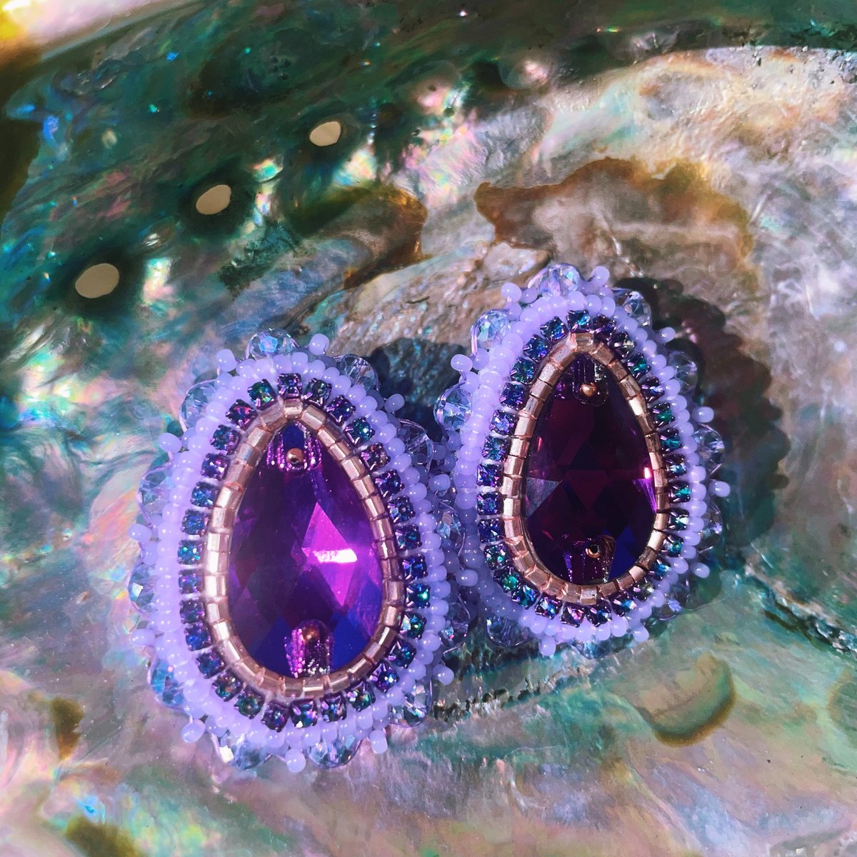 Purple cabs, copper platted beads and rhinestone banding along with gel seed beads. Edged with polished glass beads on fingernail posts with embossed synthetic leather purple backing.